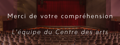 En raison de la pandémie de la Covid-19, le Centre des arts se voit contraint d’annuler ses spectacles prévus pour les mois de mai et de juin 2020. Notre billetterie demeure ouverte par téléphone du lundi au jeudi de 12 h à 17 h.